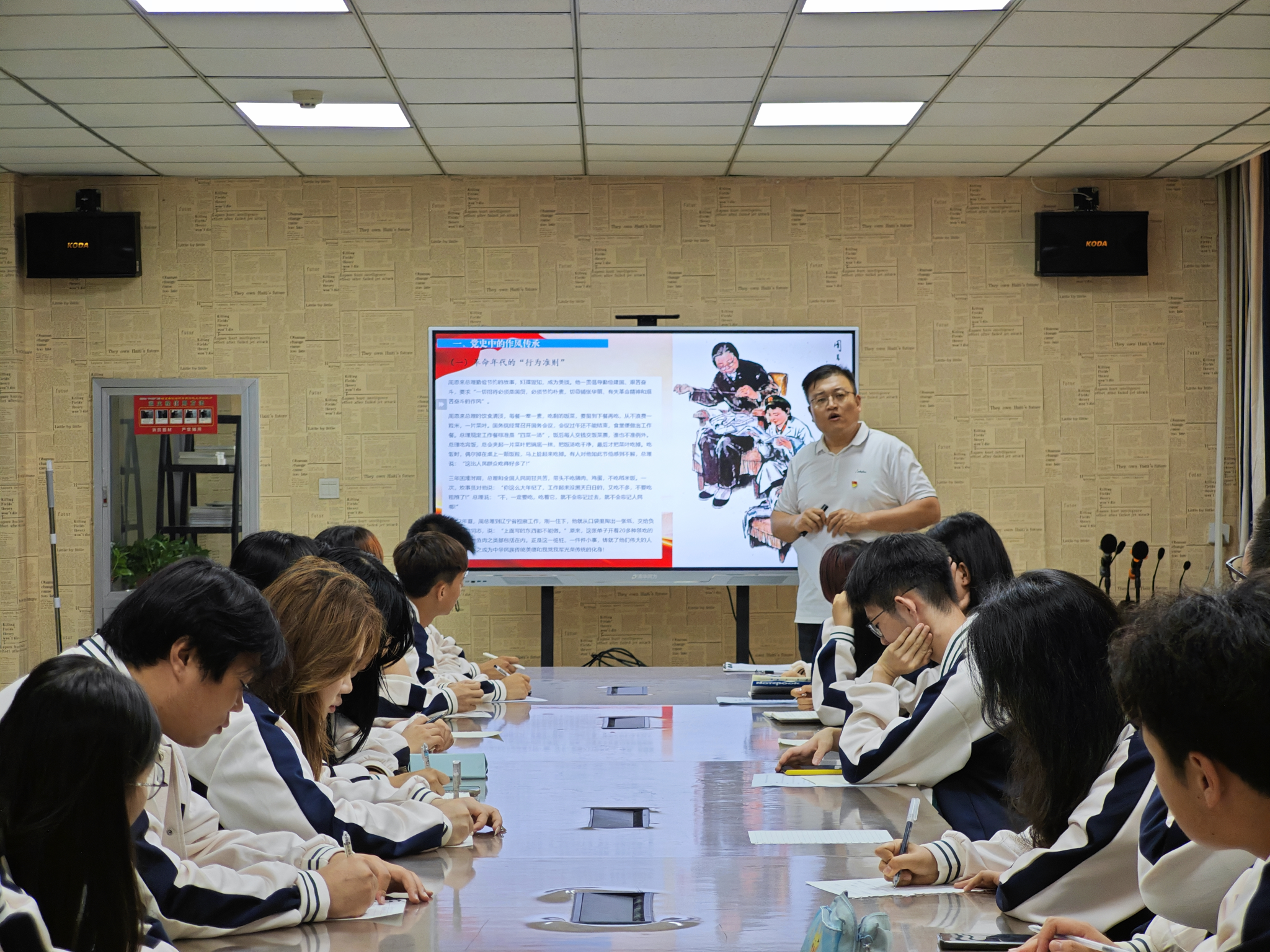 学习活动以延安整风运动老照片为开端,回顾了周恩来同志“一件睡衣补73次”等党史中的作风建设典范,阐释了党在不同历史时期对作风建设的核心要求——从1949年的“两个务必”到2012年中央八项规定的颁布,特别是“厉行勤俭节约”成为新时代作风建设的标志性事件。