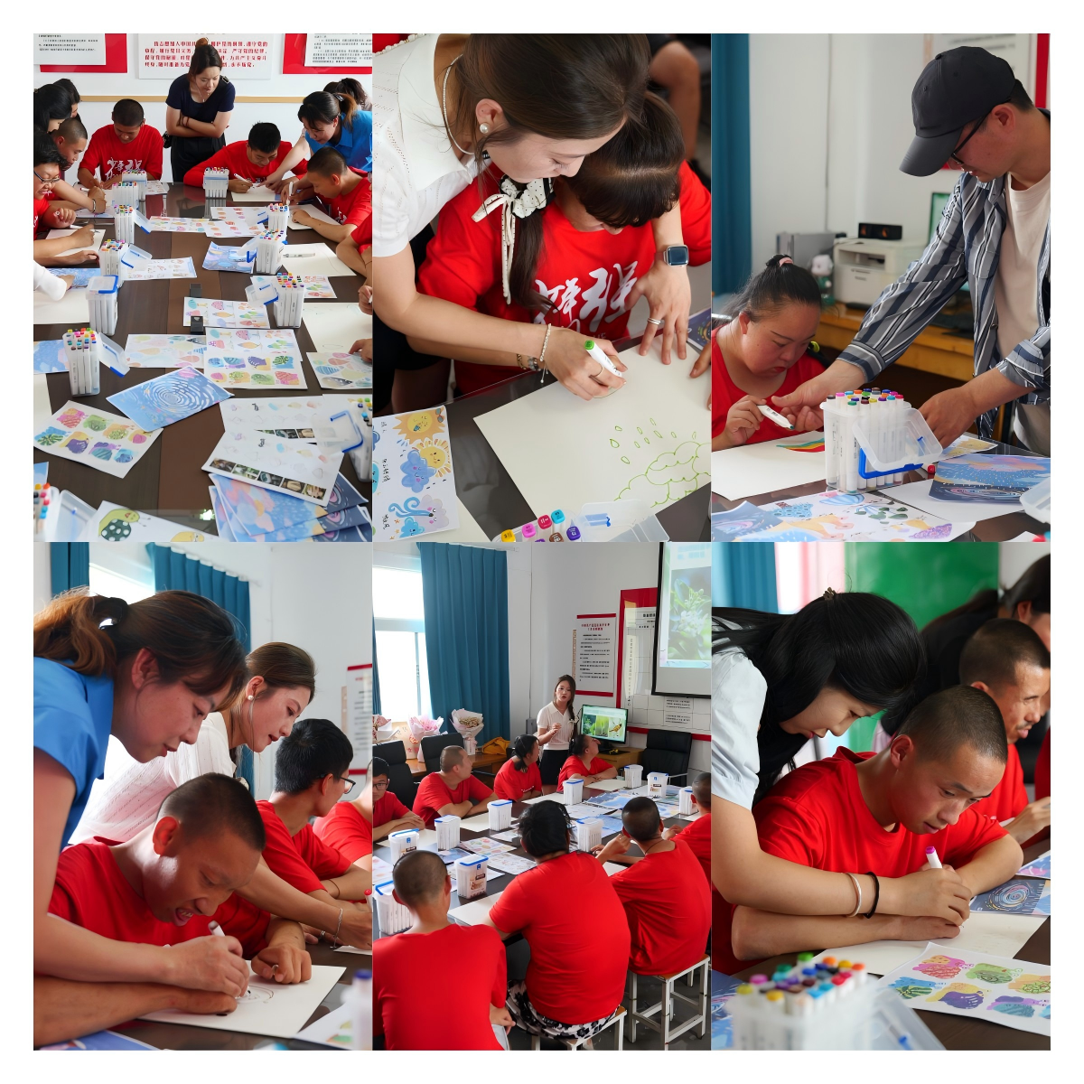 在绘画创作环节,党员师生分组协助残疾人进行简笔画创作。党员教师们耐心为残疾朋友讲解绘画技巧,手把手指导他们握笔、上色,帮助他们将心中的美好世界用画笔描绘出来。老师们巡回指导,随时解答残疾朋友在绘画过程中遇到的疑问,启发他们的创意,鼓励他们大胆发挥想象,勇敢表达内心的情感。在党员师生的悉心帮助下,一幅幅充满童趣和想象力的简笔画逐渐诞生。这些作品或许笔触稚嫩,或许构图简单,但每一幅都饱含着残疾朋友对生活的热爱和对未来的憧憬,也凝聚着党员师生的关爱与付出。